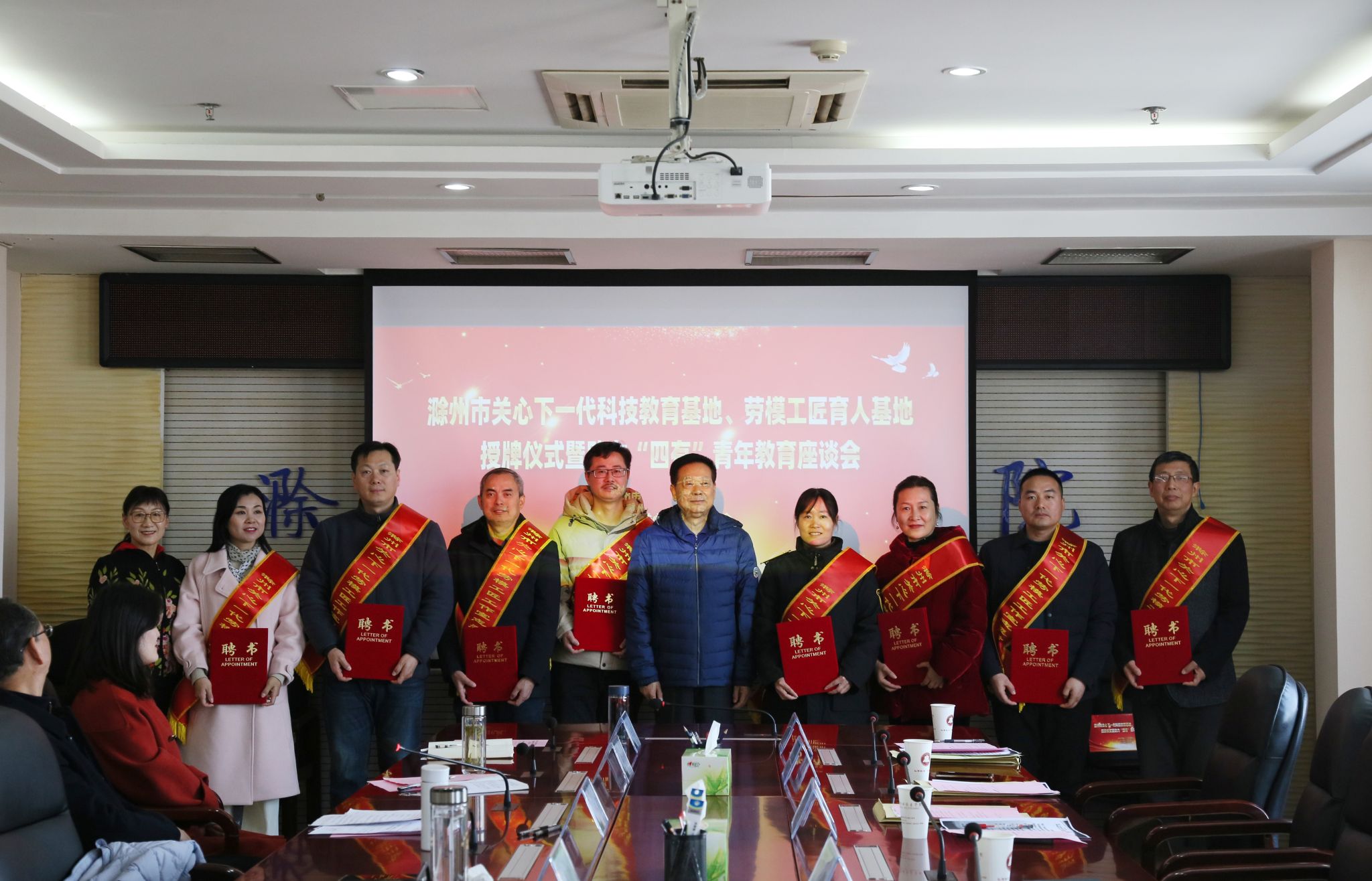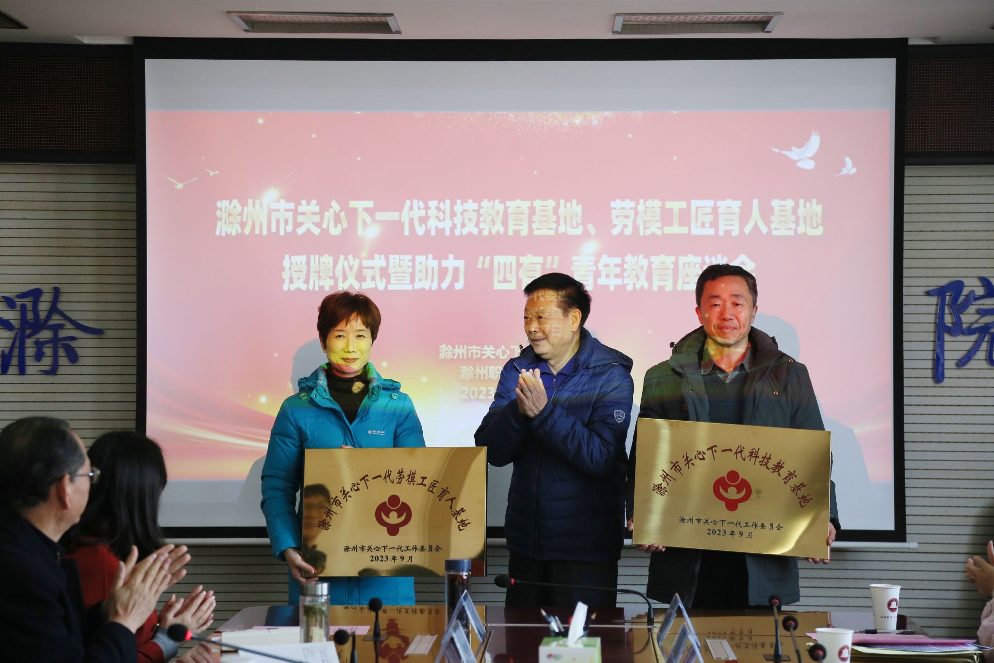 会上,傅厚华代表市关工委邀请杨家庆、校关工委副主任穆玲上台接受“滁州市关心下一代科技育人基地、劳模工匠育人基地”牌匾,并为劳模工匠工作室8名志愿者颁发证书、赠志愿者绶带。