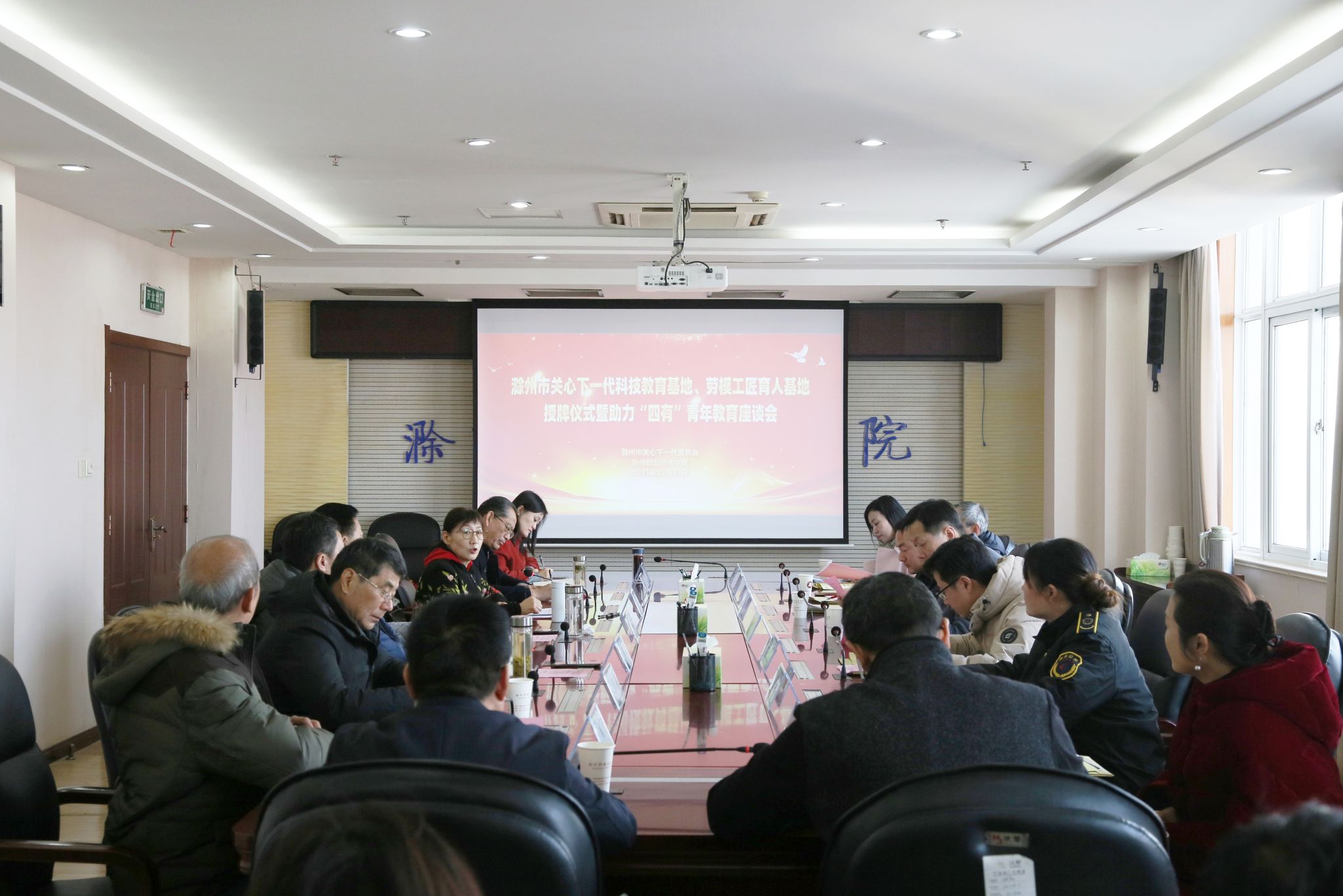 为深入学习贯彻党的二十大精神,贯彻落实习近平总书记关于职业教育的重要论述,弘扬劳模、工匠精神,发挥职业院校科技育人功能,12月27日上午,滁州市关工委来校召开滁州市关心下一代科技教育基地、劳模工匠育人基地授牌仪式暨助力“四有”青年教育座谈会。市关工委常务副主任傅厚华,市关工委副主任朱荣,市关工委办公室副主任张华忠,校党委副书记杨家庆,校党委委员、组织人事处处长王宇等出席会议。会议由朱荣主持。