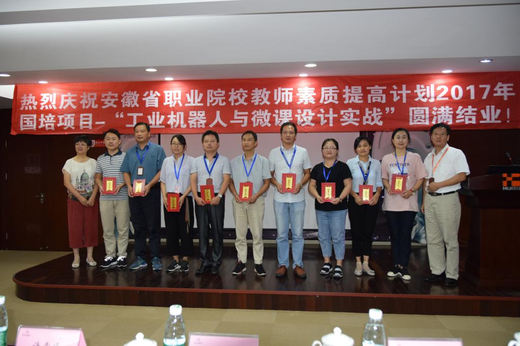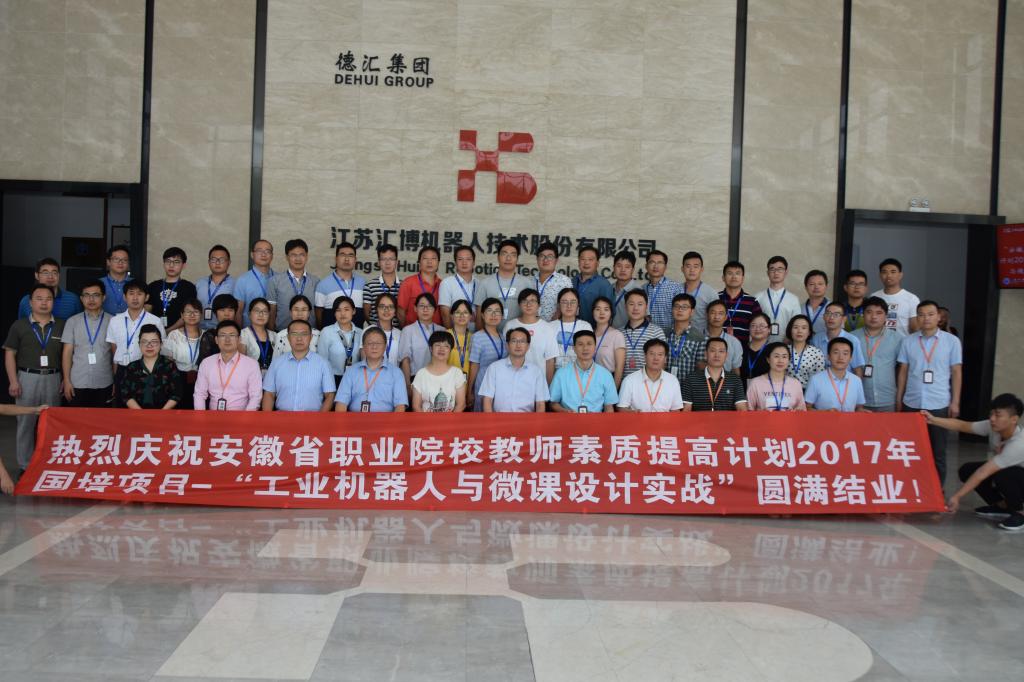 2018年8月9日上午,安徽省职业院校教师素质提高计划2017年国培项目-“工业机器人与微课设计实战”结业典礼在江苏汇博机器人技术股份有限公司如期举行,Beat365唯一官方网站党委副书记、院长许雪峰、副院长江洁、组织人事处相关同志等一行前往苏州参加结业仪式。出席结业仪式的还有汇博公司董事长孔繁河、总裁助理马明军等。