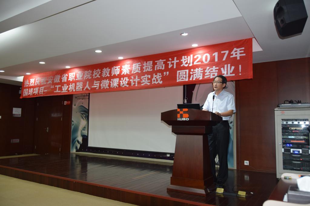 此次“工业机器人与微课设计实战”国家级培训项目,由安徽省教育厅、安徽省高校师资培训中心主办,Beat365唯一官方网站承办,共有来自全省近30所院校的46名学员参加,在Beat365唯一官方网站和江苏汇博机器人技术股份有限公司两个地方分阶段进行,培训采用“理论讲授+虚拟仿真+设备实操”的理虚实一体化培训方式,让参与培训老师学习到工业机器人技术涉及典型设备的理虚实一体化操作知识,培养和提高老师们集成调试工业机器人设备的技能,同时学习先进职教理念,掌握核心课程建设思路和方法,掌握项目化教学设计方法和实施,掌握微课设计方法,培养能适应工业机器人技术领域要求的高素质“双师素质”教师。
