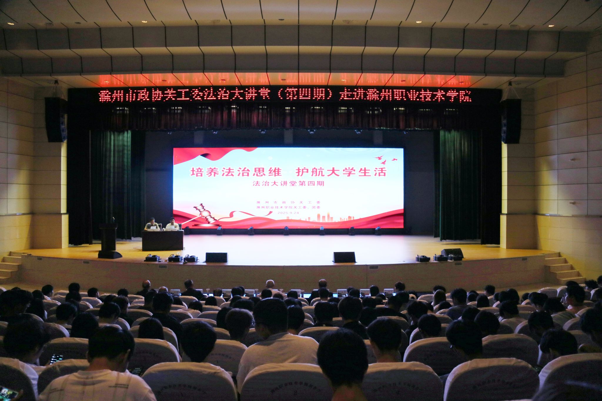 为深入贯彻落实习近平法治思想,进一步增强青少年法治意识和自我保护意识,深入推进滁州市关工委“用法施爱·护苗成长”法治教育工作品牌建设,9月24日,滁州市政协关工委联合校关工委、团委邀请洪飞律师在学校大礼堂举行“关爱明天,普法先行”青少年法治宣传教育报告会。市政协原副主席、市关工委常务副主任孙敏民,市政协副秘书长范迪斌,市政协原副秘书长、关工委主任胡新忠,市政协经济委副主任、关工委副主任李锡富,市政协机关党委原书记、关工委副主任张先礼,市政协文史委副主任、关工委副主任刘萍,市教育体育局关工委主任俞凤鸣,校党委委员、组织人事处处长王宇出席。报告会由校党委副书记杨家庆主持。各二级学院学生代表共600余人参加。