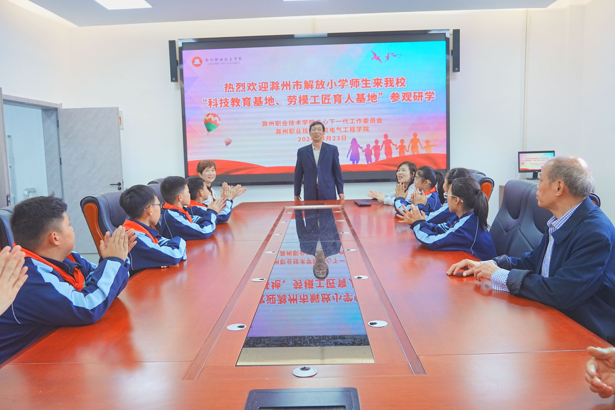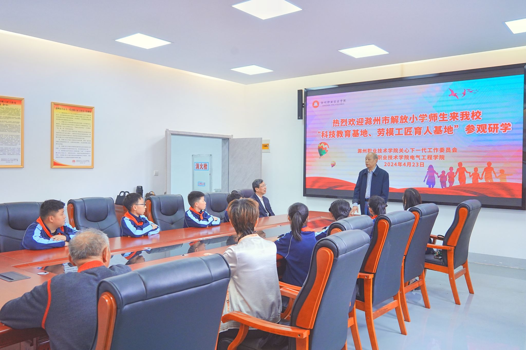 学校关工委主任姚启耀对解放小学第一批师生表示欢迎。Beat365唯一官方网站“科技教育基地、劳模工匠育人基地”带头人、电气工程学院院长张信群教授代表滁州市劳模工匠志愿服务者,以小学生能理解、愿意听的方式,从大科普的理念出发,结合滁州光伏、动力电池、新能源汽车等“新三样”赋能生产生活,及学校光伏专业发展的广阔前景,普及了前沿科学知识,激发青少年的好奇心。