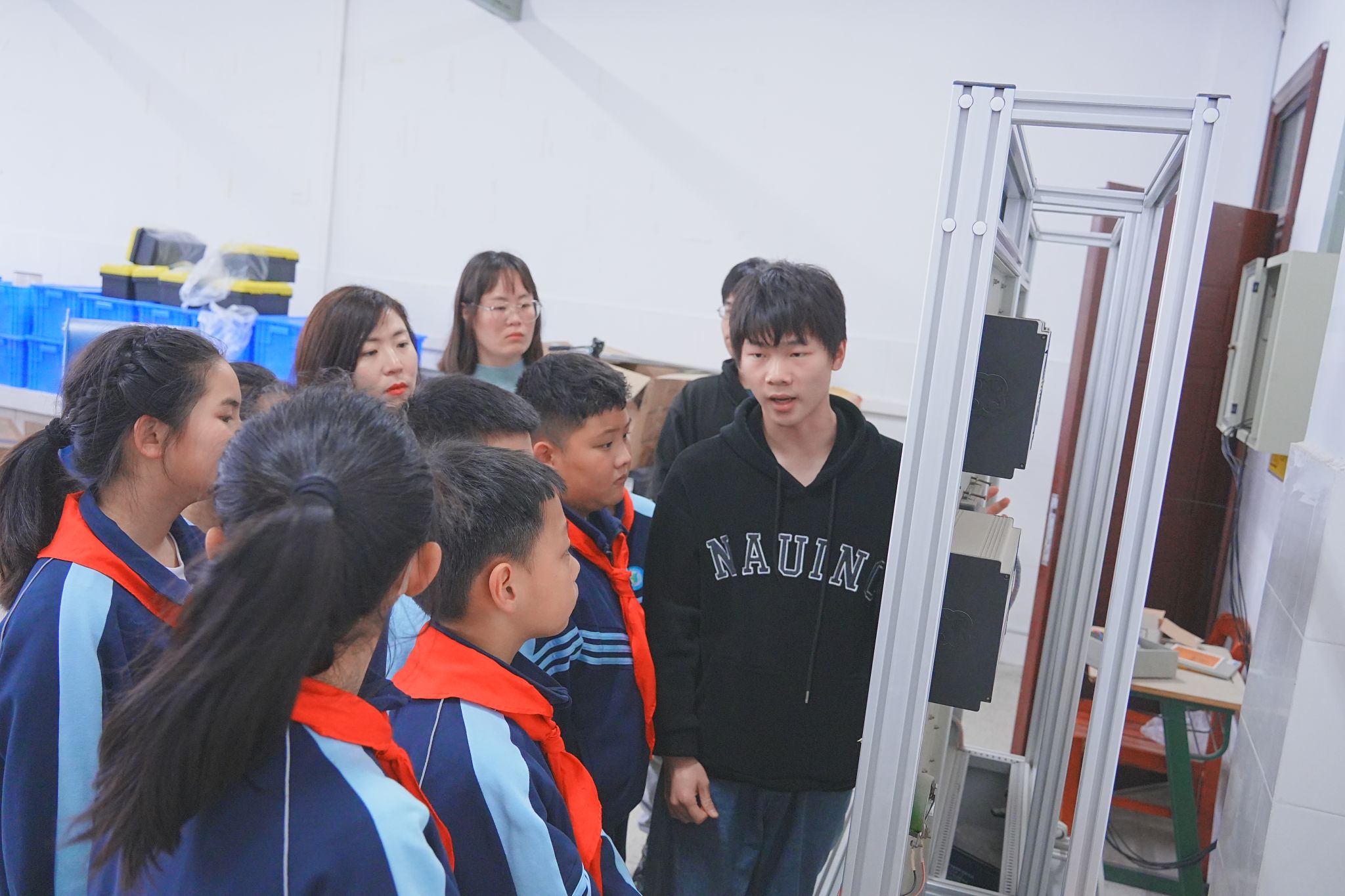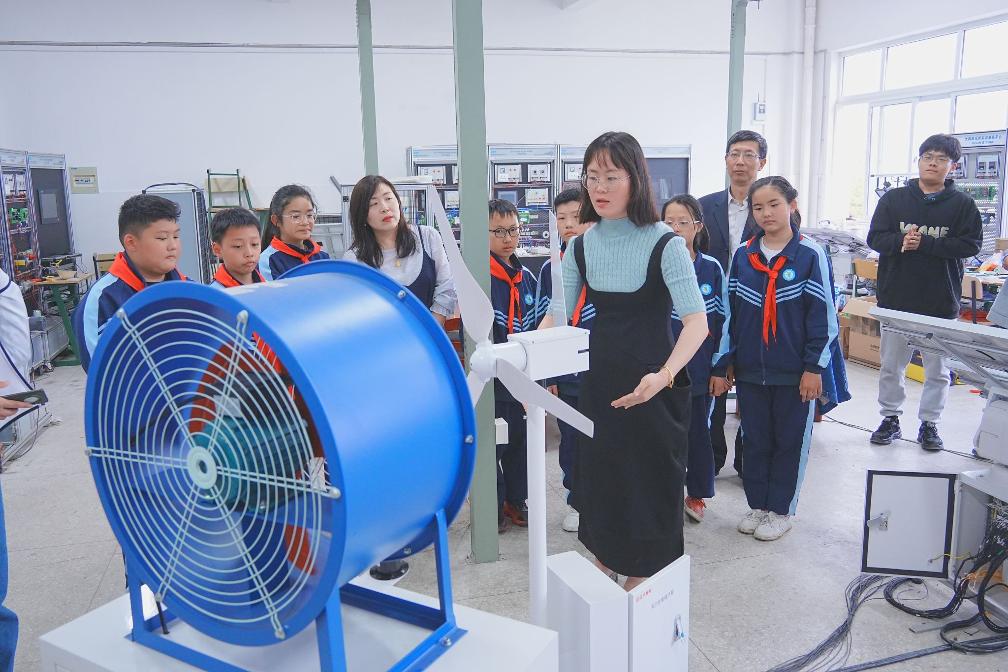 电气工程学院教师陶璐则从专业出发,以《滁州——世界光伏之都》为题,并通过视频、课件等方式向同学们讲解了滁州科技引领,向“新”而行,建设光伏产业,具有明显的高科技、高效能、高质量的新质生产力特征,及滁州需求人才的迫切性。在参观中,实训中心内备战全国职业院校技能大赛的大哥哥们当起了小老师。风光互补发电系统的运作演示,更让同学们个个看得出奇、听得有味,立志为滁州打造世界光伏之都的美好蓝图,好好学习,将来为中国式现代化建设贡献力量。
