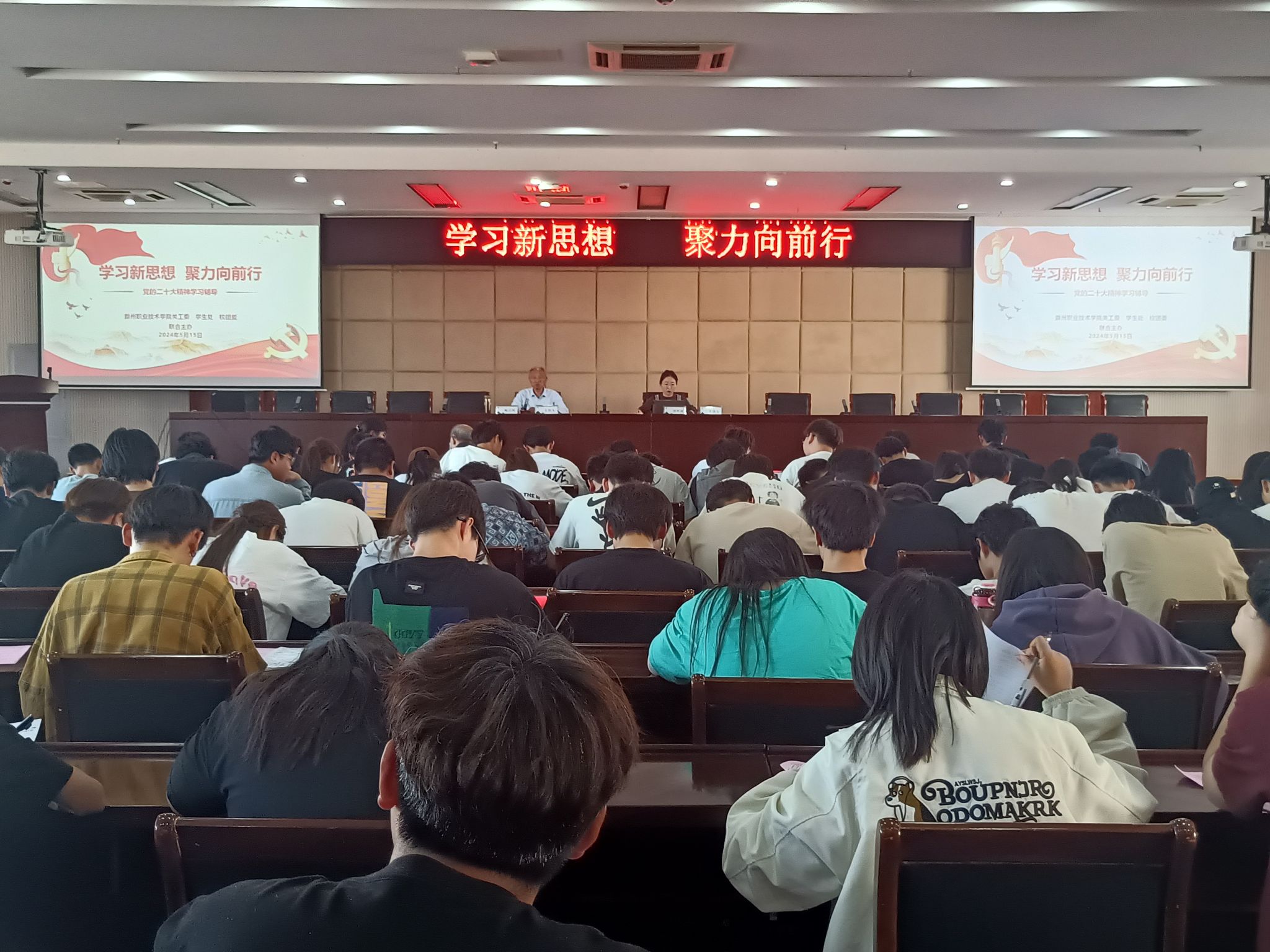 5月15日下午,校关工委联合学生处、团委在大一学生中开展“学习新思想 聚力向前行——党的二十大精神学习辅导”活动。这次活动是在前期“复印资料学、编印答题学、制作展板学”的基础上,以集中答题形式开展(类似考试),旨在为大一学生认认真真地上一堂新形势的“思政课”,让正能量产生大流量,活动现场马克思主义学院教师周明珠作现场答题学习辅导。